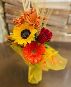 Adorable Bud vase wrapped in fiber tissue and filled with a Sunflower, Red rose, Gerber daisy, and fall mum's , accented with fall leaves and wheat!