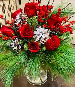 A Christmas Colonial Dozen of roses designed in a clear vase..