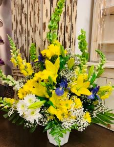 A funeral mache filled with Yellow snaps, white snaps, yellow Lilly's, blue iris, yellow daises, white mums, accented with babies breath.