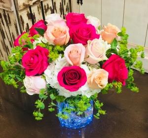 Light pink roses, hot pink roses, white hydrangea, arranged in a clear cylinder