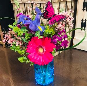 Pink Gerber daises, purple iris, fushia stock, pink ginestra designed in a colored vase with under water lighting!!