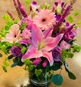 A beautiful pink and lavender arrangment, filled with Gerber daisies, Roses, Lily's, Dendrobiums. Ranunculus.