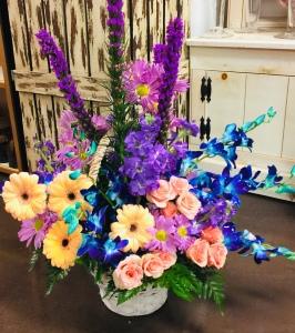 Basket of purple liatris, blueberry dendrobidum, daises, peach spray roses, peach gerber daises, purple stock!