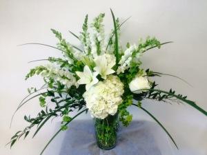White snap dragon,white Lily’s, white hydrangea, Bella of Ireland. Displayed in a glass vase.