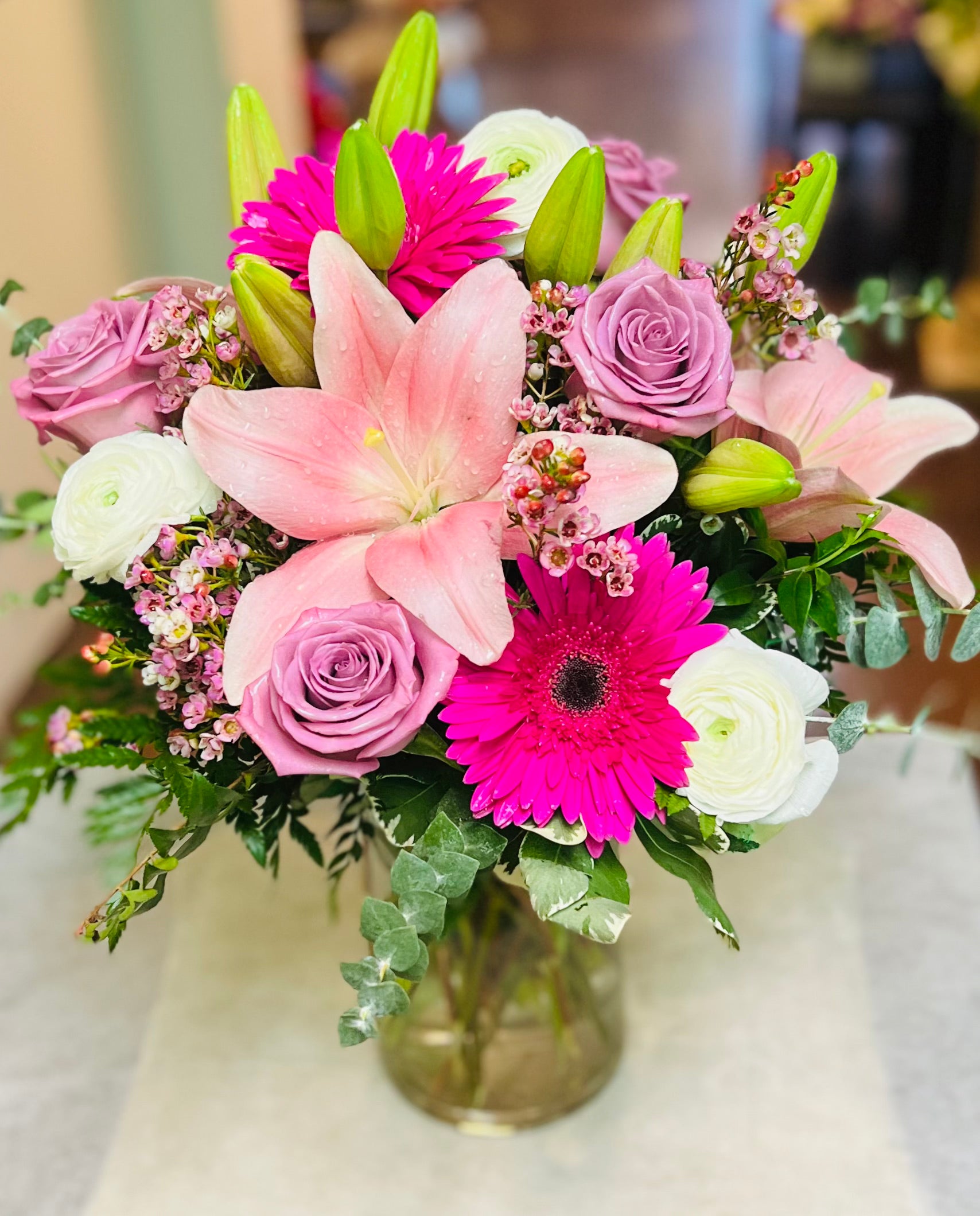 An arrangement of roses, lillies, Gerbera daisies, wax flower, and mixed greens designed in a vase.