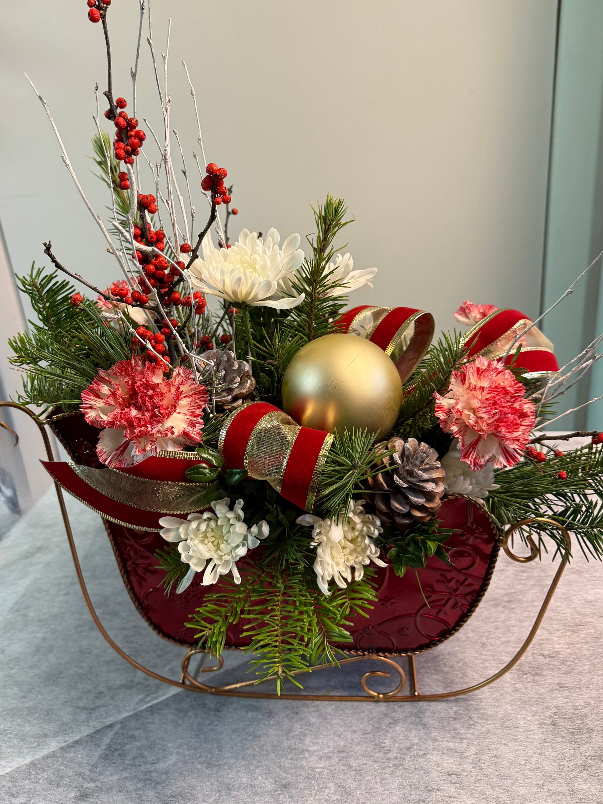 A beautiful festive arrangement of carnations, mums, berries, and pine designed in a metal keepsake sleigh container, with twigs, pinecones, an ornament, and a bow to complete the Christmas holiday look.