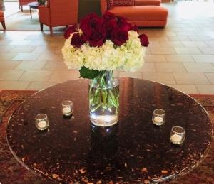 Dozen of roses on a cloud of hydrangea, arranged in a cylinder illuminated vase